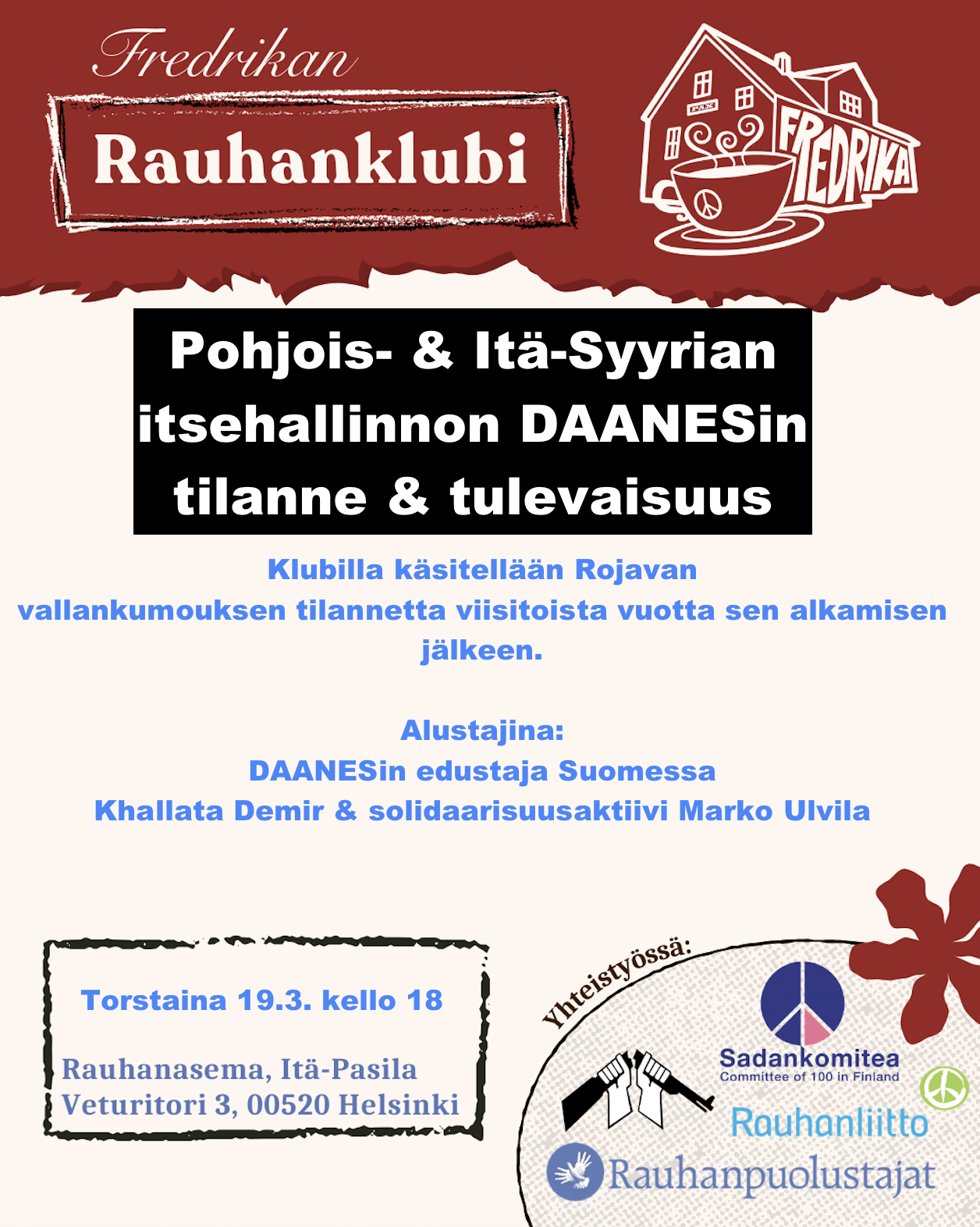 Rauhankahvila Fredrikan klubilla käsitellään Rojavan vallankumouksen tilannetta viisitoista vuotta sen alkamisen jälkeen. Joulukussa 2024 Damaskoksessa valtaan noussut HTS-ryhmä ja sen johtaja al-Sharaa hyökkäsi tammikuussa 2026 voimalla kurdivetoisen demokratialiikkeen johtamille itsehallintoalueille. Ensin se otti hallintaansa kaksi itsehallinnollista kaupungiosaa Aleppossa ja sen jälkeeen muun muassa Rakkan kaupungin maan keskiosissa ja Al-Holin pidätysleirin. Tammikuun lopulla itsehallinto ja Syyrian väliaikainen hallitus tekivät sopimuksen aseellisten taistelujen lopettamisesta ja itsehallinnon integroimisesta osaksi Syyrian hallintoa. Sopimuksesta huolimatta väliaikainen hallitus kurjistaa Kobanen kaupunkia pitämällä sitä ilman sähköä ja saartamalla sitä sotilaallisesti.