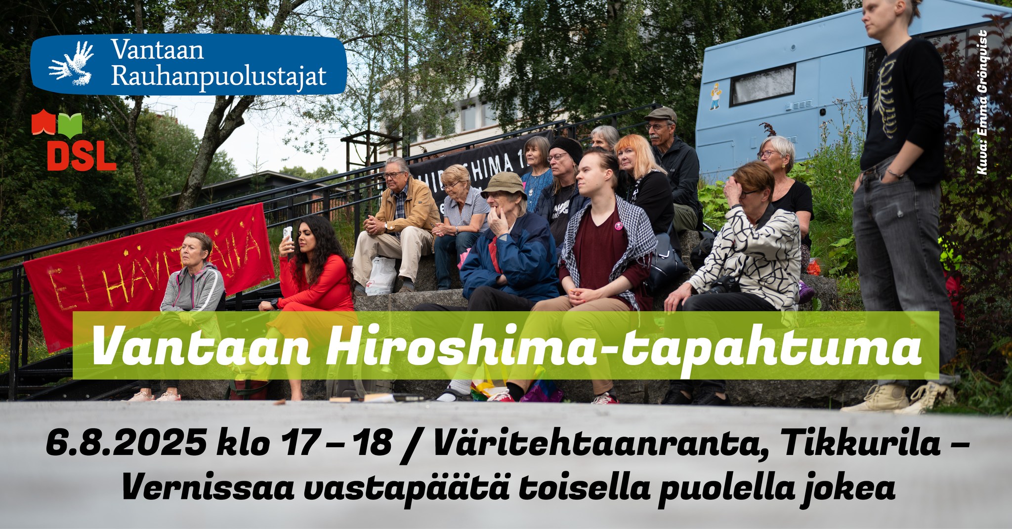 Vuosittaisena Hiroshima-päivänä 6.8. muistetaan Yhdysvaltojen vuonna 1945 Japanin Hiroshiman ja Nagasakin kaupunkeihin pudottamien ydinpommien uhreja ja pommien aiheuttamaa valtavaa tuhoa. Hiroshima-päivä on merkittävä ydinaseiden ja militarismin vastainen ajankohtainen toimintapäivä. Vantaan Rauhanpuolustajat vaatii Suomea allekirjoittamaan ydinaseet kieltävän YK:n sopimuksen sekä on tehnyt aloitteen Vantaan kaupungille sopimuksen tavoitteiden tukemisesta.