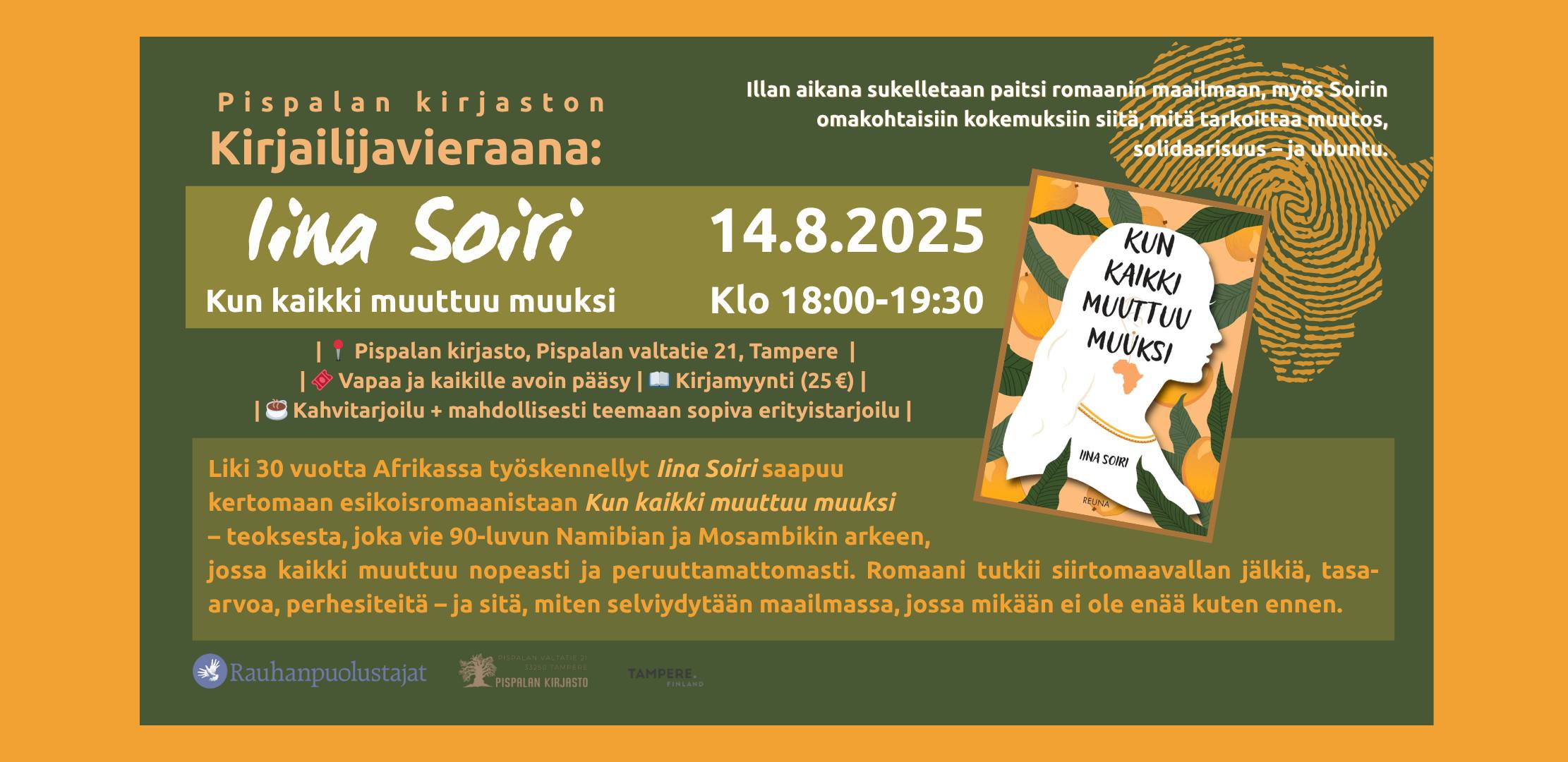 Afrikassa liki 30 vuotta työskennellyt Iina Soiri saapuu Pispalan kirjastolle kertomaan esikoisromaanistaan Kun kaikki muuttuu muuksi (Reuna 2025), joka vie lukijan Namibian itsenäisyyden alkuvuosiin ja sodanjälkeiseen Mosambikiin.