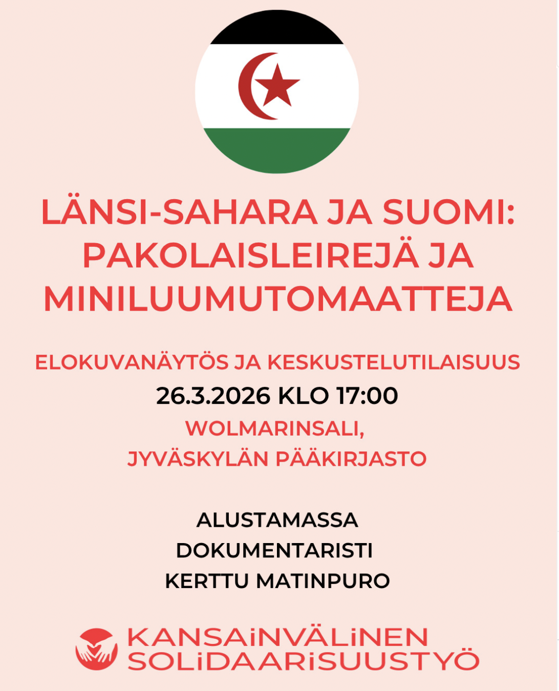 Mikä on Länsi-Sahara, miten moderni kolonialismi näkyy suomalaisessa ruokakaupassa ja mitä me voimme tehdä sorrettujen kansojen vapauden puolesta? Tule ottamaan selvää torstaina 26.3. kello 17 Jyväskylän pääkirjastoon!