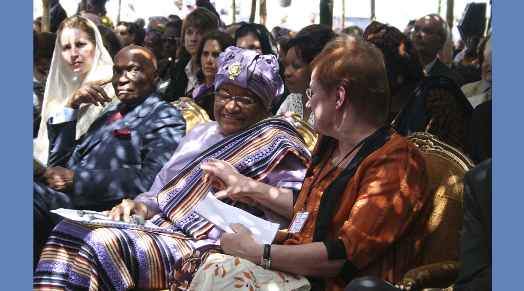 Bild: I och med Liberias Ellen Johnson Sirleaf fick Afrika 2006 en första folkvald kvinnlig president. Själv fick hon Nobels fredspris 2011. Tarja Halonen (till höger) var hennes gäst under den stora internationella kvinnokonferensen i Monrovia 2009. Längst till vänster Aisha Gaddafi, dotter till den libyske diktatorn, då ännu vid makten. Hon representerade Afrikanska unionen. Mellan henne och JohnsonSirleaf sitter Senegals dåvarande president Aboulaye Wade.