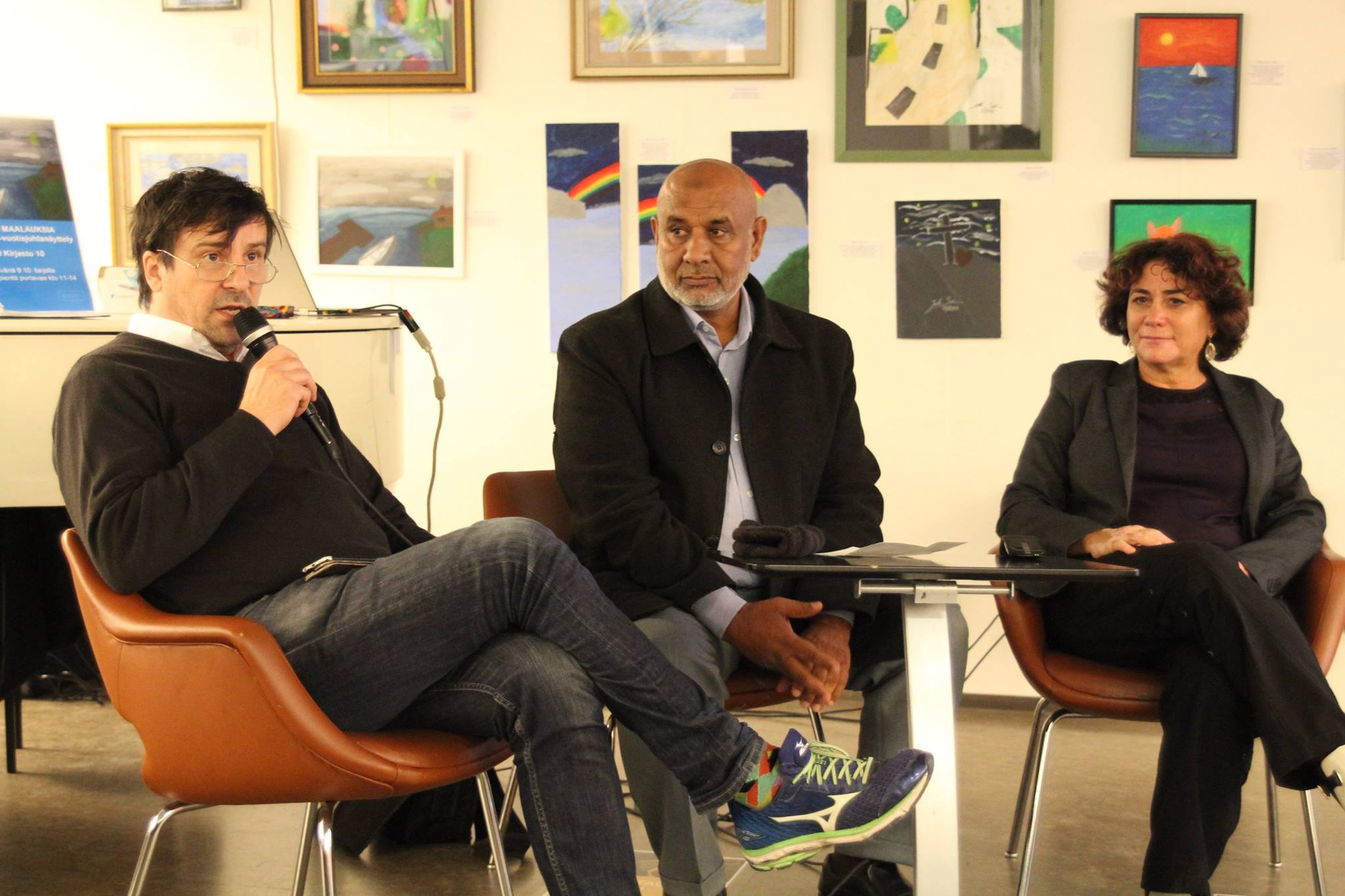 ICAHD Finlandin ja Rauhanpuolustajien vieraiksi lokakuussa saapuneet aktivistit Attia Al-Asam (kuvassa keskellä) ja Yeela Raanan (oikealla) toivoivat, että tieto näistä ”tunnustamattomissa” kylissä elävistä palestiinalaisista leviäisi ja heidän elinolonsa saataisiin kohenemaan. Yleisötilaisuudessa Helsingissä mukana lisäksi Rauhanpuolustajien toiminnanjohtaja Teemu Matinpuro.