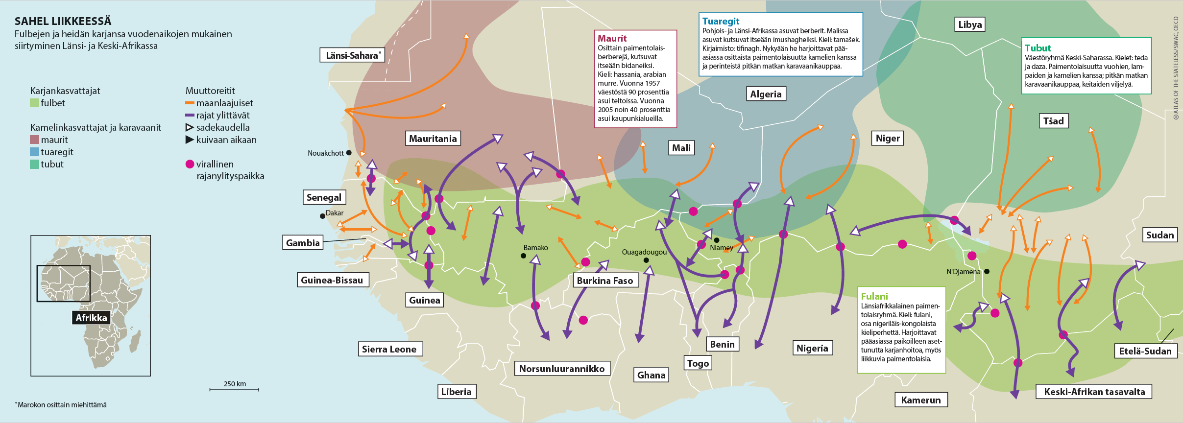 Luku West African nomads: Moving with the herds teoksesta Atlas of the Stateless: Facts and figures about exclusion and displacement. Rosa-Luxemburg-Stiftung. Berlin, 2020.