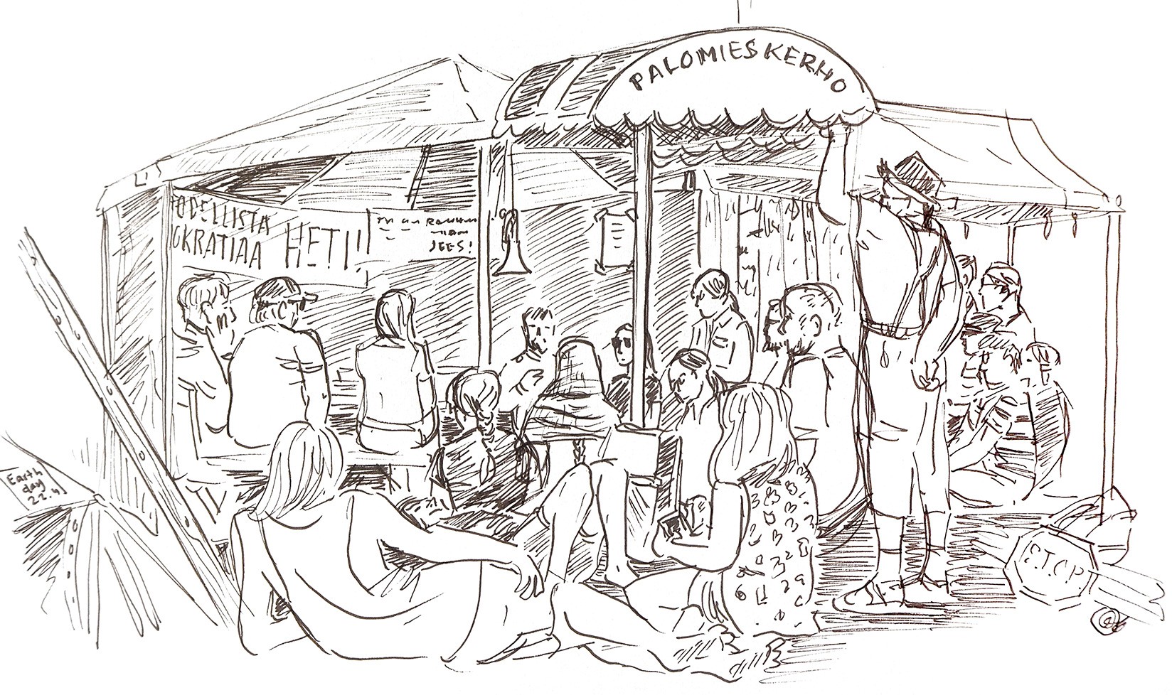 Haluan myös erityisesti muistaa vastikään edesmennyttä paikallisen rauhanliikkeen tukijaa, loputtoman lämminsydämistä Liisa Tavia. Viimeiseksi jäänyt viestinvaihtoni Liisan kanssa koski nimenomaan Maan puolustusleiriä, jonka järjestämisestä Liisa oli todella ilahtunut. Hän toivoi, että leirin tunnelmista pääsisi jälkeenpäin lukemaan Rauhanpuolustaja-lehdestä. Osoitan nämä sanat Liisan muistolle.
