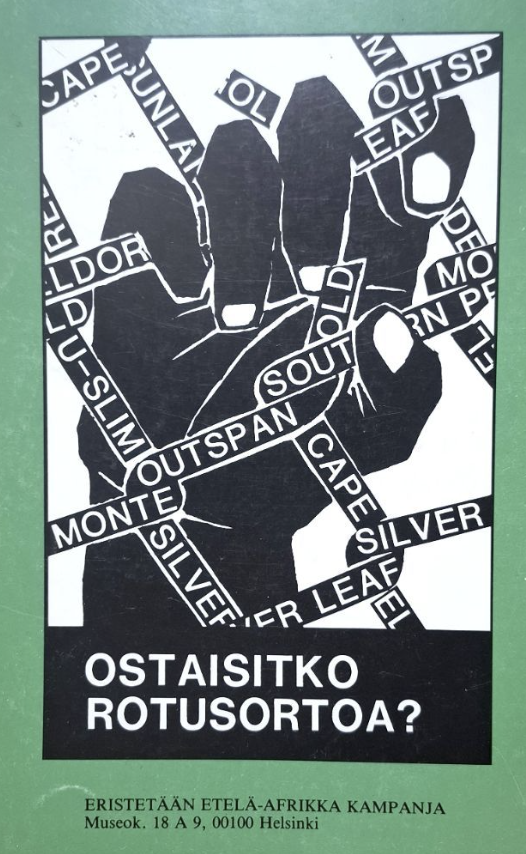 Kirjoittaja Esko Turunen oli vuosina 1985–87 Rauhanpuolustajien Afrikka-komitean työntekijänä järjestämässä apartheidin vastaista toimintaa ympäri Suomea. Artikkeli perustuu 7. helmikuuta 2026 Tampereella järjestetyillä Ay-väen rauhanpäivillä pidettyyn esitelmään ja sen jälkeen käytyyn paneelikeskusteluun Finnwatchin toiminnanjohtaja Sonja Finerin ja JHL:n toimialajohtaja Saila Ruuthin kanssa.