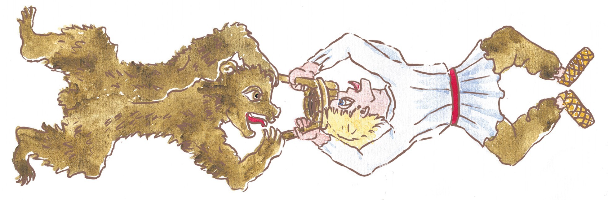 Kettu, Ilves, Kauris ja Pöllö katsoivat ihmeissään Karhua. Kettu, joka oli porukan terävin, kysyi: ”Mitä ihmettä sinä siinä hypit, noidutko?”