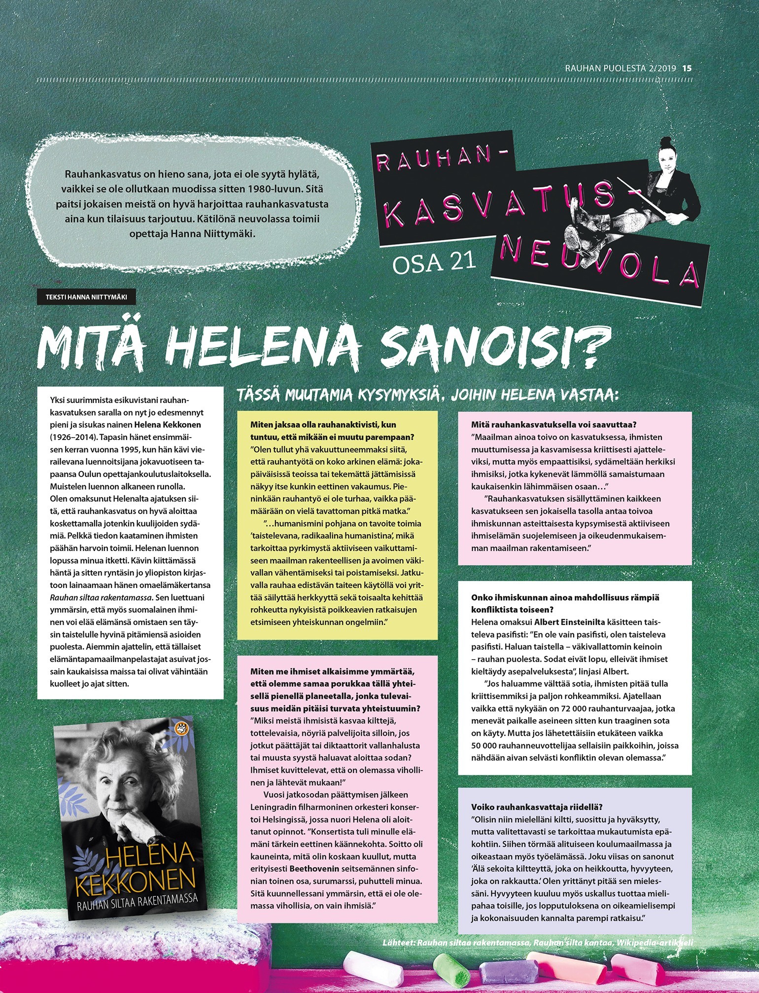 Yksi suurimmista esikuvistani rauhankasvatuksen saralla on nyt jo edesmennyt pieni ja sisukas nainen Helena Kekkonen (1926–2014). Tapasin hänet ensimmäisen kerran vuonna 1995, kun hän kävi vierailevana luennoitsijana jokavuotiseen tapaansa Oulun opettajankoulutuslaitoksella. Muistelen luennon alkaneen runolla. Olen omaksunut Helenalta ajatuksen siitä, että rauhankasvatus on hyvä aloittaa koskettamalla jotenkin kuulijoiden sydämiä. Pelkkä tiedon kaataminen ihmisten päähän harvoin toimii. Helenan luennon lopussa minua itketti. Kävin kiittämässä häntä ja sitten ryntäsin jo yliopiston kirjastoon lainaamaan hänen omaelämäkertansa Rauhan siltaa rakentamassa. Sen luettuani ymmärsin, että myös suomalainen ihminen voi elää elämänsä omistaen sen täysin taistelulle hyvinä pitämiensä asioiden puolesta. Aiemmin ajattelin, että tällaiset elämäntapamaailmanpelastajat asuivat jossain kaukaisissa maissa tai olivat vähintään kuolleet jo ajat sitten.