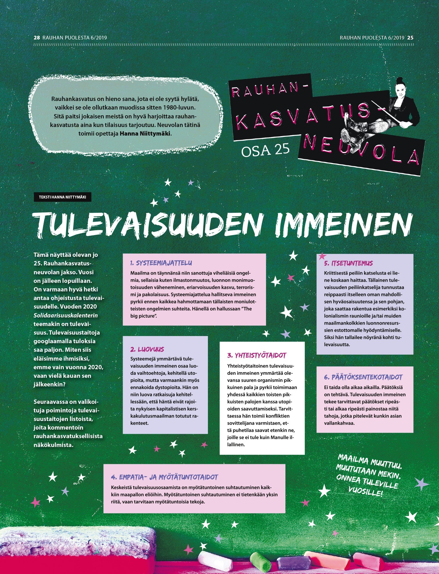 Tämä näyttää olevan jo 25. Rauhankasvatusneuvolan jakso. Vuosi on jälleen lopuillaan. On varmaan hyvä hetki antaa ohjeistusta tulevaisuudelle. Vuoden 2020 Solidaarisuukalenterin teemakin on tulevaisuus. Tulevaisuustaitoja googlaamalla tuloksia saa paljon. Miten siis eläisimme ihmisiksi, emme vain vuonna 2020, vaan vielä kauan sen jälkeenkin?