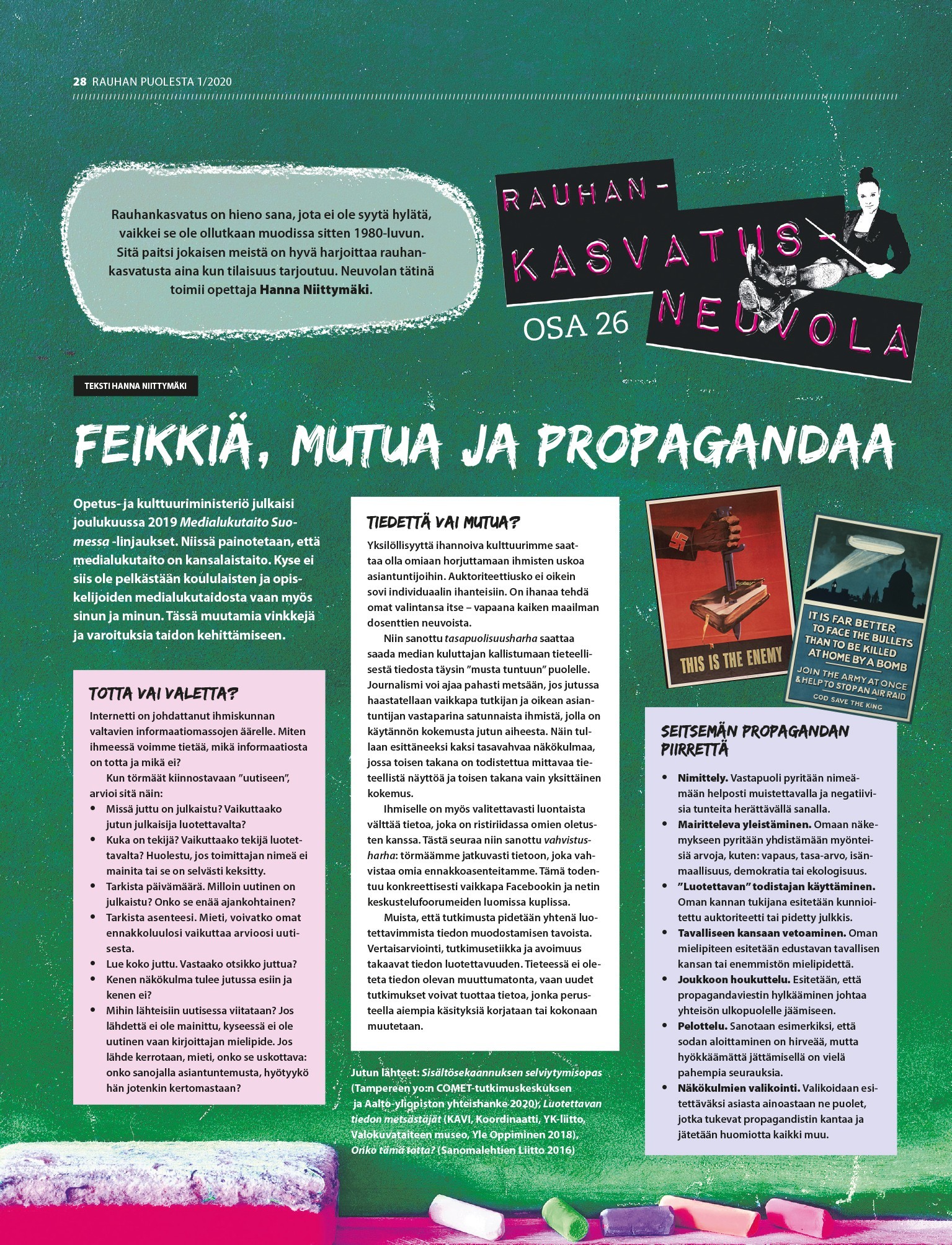 Jutun lähteet: Sisältösekaannuksen selviytymisopas (Tampereen yo:n COMET-tutkimuskeskuksen ja Aalto-yliopiston yhteishanke 2020), Luotettavan tiedon metsästäjät (KAVI, Koordinaatti, YK-liitto, Valokuvataiteen museo, Yle Oppiminen 2018), Onko tämä totta? (Sanomalehtien Liitto 2016)