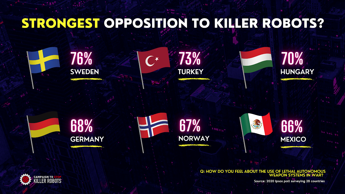 28 maassa vuonna 2020 tehdyn mielipidemittauksen mukaan yli kolme viidestä ihmisestä (62 %) vastustaa sellaisten asejärjestelmien kehittämistä, joka voisi valita kohteensa ja hyökätä ilman ihmisen ohjausta.